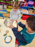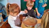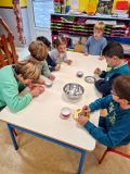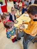 Dans le cadre de la semaine du goût, 7 CM1 sont venus dans la classe des élèves de petite section pour confectionner des galettes de sarrasin et du beurre.